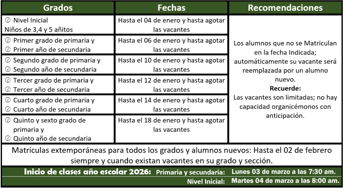 La Dirección ha establecido el rol de matrícula con la finalidad de brindar un excelente servicio en la parte administrativa ya que muchos padres de familia nuevos desean que sus hijos estudien en nuestra institución y nuestra institución no cuenta con muchas vacantes para el año 2026.